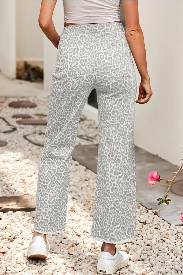 Spring Leopard Frayed Edge Wide Leg High Waist Jeans